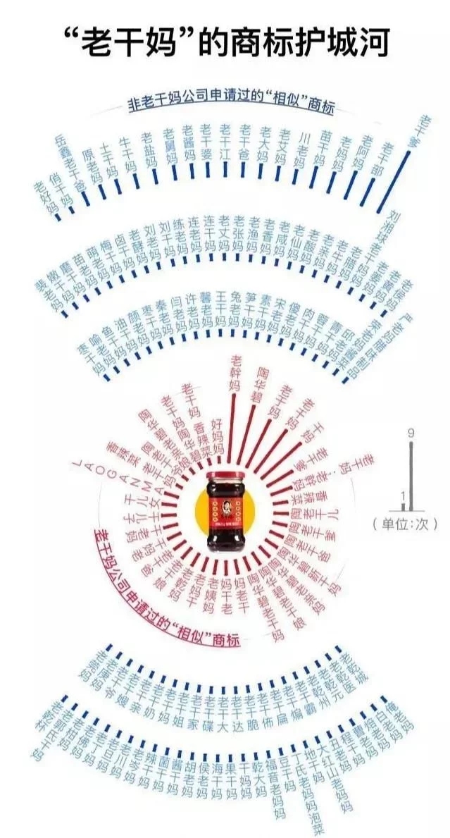 上图红色字体为老干妈申请的商标,蓝色字体则非老干妈公司申请的商标。虽然有不少商标想靠拢“老干妈”这块招牌,但是老干妈公司已经围绕“老干妈”这一品牌筑起了一道坚实的商标护城河。可以说,老干妈在保护自己品牌上煞费苦心,防御指数也是不容小觑!